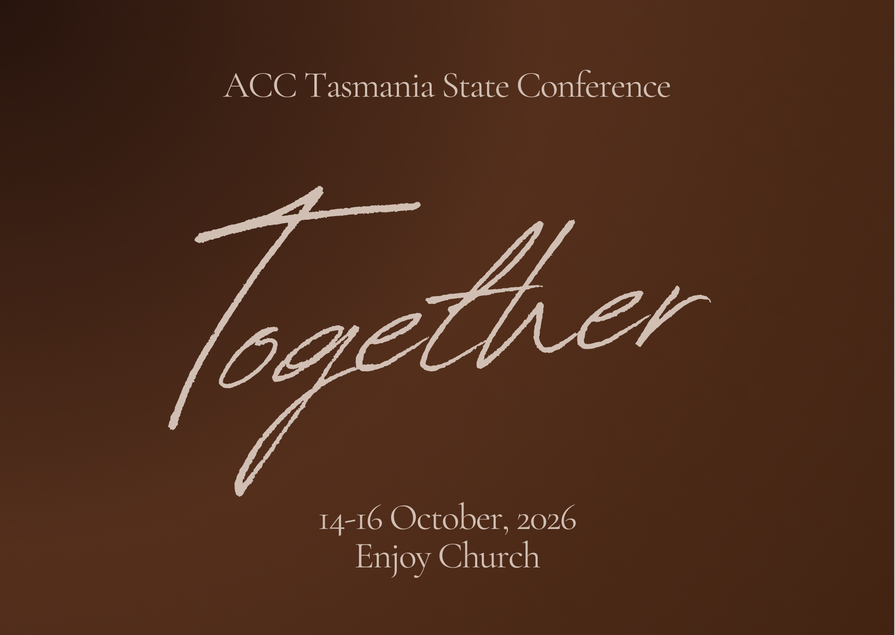 Together is a statewide gathering for the whole ACC Tasmania family. This conference brings churches and congregations from across the state into one room to worship, be encouraged, and build unity as the body of Christ. Whether you’re a pastor, leader, volunteer, or church member, Together is a time to connect, be refreshed spiritually, and step into the future of the Church in Tasmania as one.