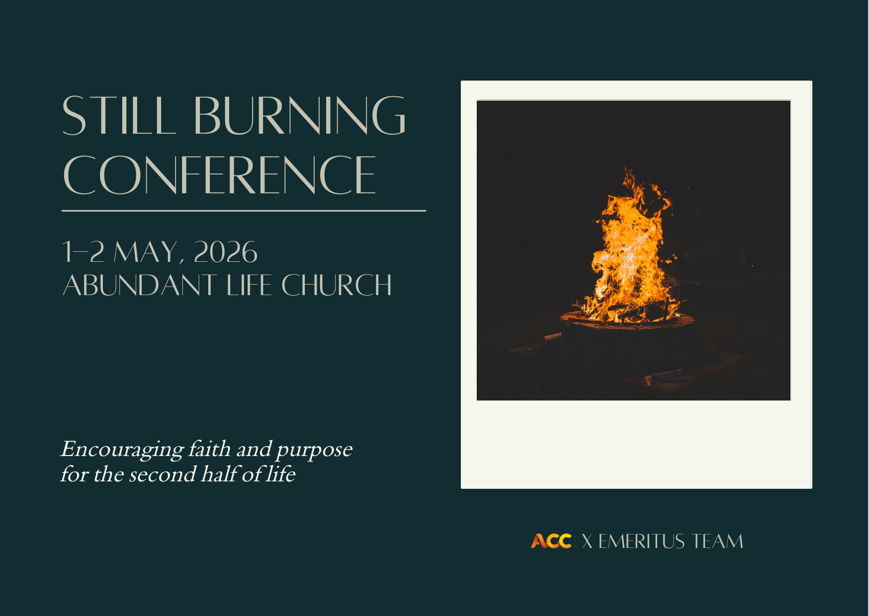 Abundant Life ChurchStill Burning is a 2-day conference designed to encourage faith, purpose, and passion for the second half of life. This gathering is for those who want to keep growing, serving, and making a difference in God’s Kingdom. Through inspiring teaching, worship, and connection with others in a similar stage of life, you’ll be refreshed, strengthened, and reminded that God’s calling on your life is far from finished.